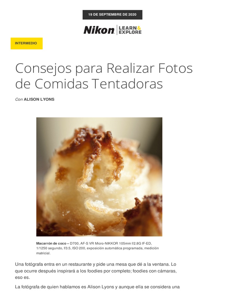 Este artículo proporciona consejos para tomar fotografías atractivas de comidas. La autora, Alison Lyons, explica que se sienta cerca de ventanas en restaurantes y a veces cambia de mesa para aprovechar la luz. También habla sobre componer los platos y quitar elementos de distracción para enfocarse en la comida. El artículo incluye consejos sobre equipo básico y técnicas para mejorar las fotografías de alimentos.